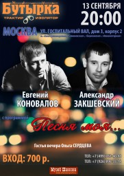 В трактире «Бутырка» состоится концерт Александра Закшевского и Евгения Коновалова. Гостья вечера Ольга Сердцева. Будет очень уютно и душевно. Приходите на наш концерт и не пожалеете!