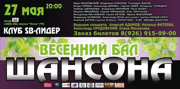 Приглашаю своих друзей и поклонников на ВЕСЕННИЙ БАЛ ШАНСОНА!! 27 мая в М-КЛУБ на ВДНХ,много музыки,общения и хорошего настроения:)Мои песни тоже для ВАС!!