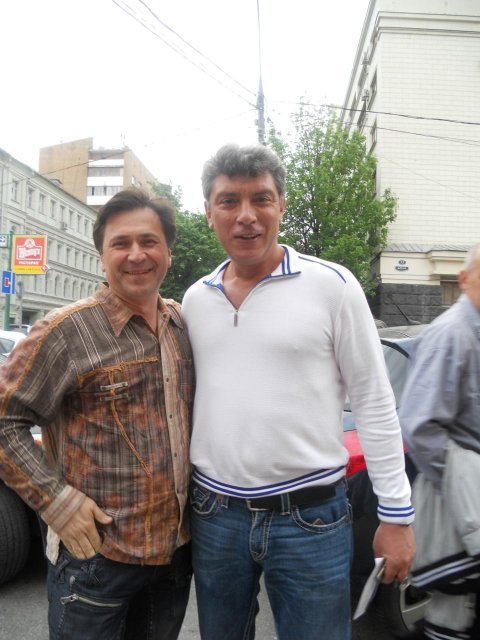 С Борисом Немцовым на прогулке по Арбату:))Было весело всем...рассмешили нас с ним перед сьемкой,вот поэтому и весело:))