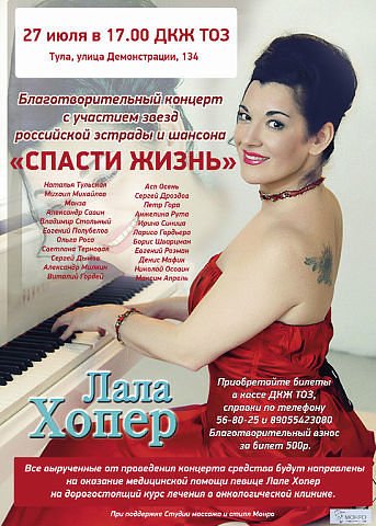 Поклонников в городе ТУЛА приглашаю 27 июля на концерт в поддержку певицы Лалы Хопер...